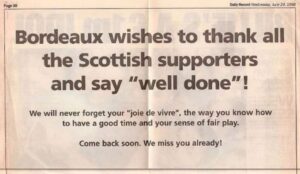 That evening in 1998 was symbolic of what’d happened regarding the Scottish football team and its supporters.  While the former seemed doomed to flounder at these big events, the latter had given up on any expectation of their team doing well and were simply determined to enjoy themselves, win, lose or draw.  In the process, their self-deprecating humour and dedication to good-natured partying earned them the reputation of being one of the best sets of football fans in the world.  For instance, the city council of Bordeaux, where Scotland had played two of their 1998 World Cup games, took out a full-page advert in Scottish newspaper the Daily Record to thank the fans for their behaviour: “We will never forget your ‘joie de vivre, the way you know how to have a good time and your sense of fair play.  Come back soon.  We miss you already!”  I’m sure those sentiments were shared by Bordeaux’s bar and off-licence industry.