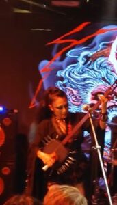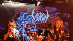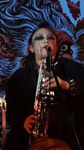 But in the three decades since – during which time, vocalist, keyboardist and bassist Mirai Kawashima has been the band’s leading light and one, enduring member – Sigh have also distinguished themselves with their willingness to experiment.  Their sound has incorporated elements from classical music, traditional Japanese music and elsewhere, so that it’s earned such epithets as ‘avant-garde’ and ‘progressive’.  Their eclectic-ness was certainly on display tonight.  For example, their second singer and multi-instrumentalist Dr Mikannibal – according to Google AI, she’s actually a professor with ‘a doctorate in physics form the University of Tokyo’ – played a shamisen at one point and a saxophone at another.  That was when she wasn’t pouring fake blood over her face from a goblet and shrieking sepulchrally – all good, ghoulish fun, by the way.