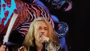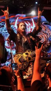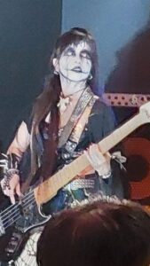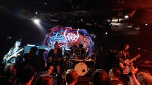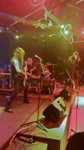 Their set – much of which was drawn from the 2007 album Hangman’s Hymn, which they re-recorded this year as I Saw the World’s End – Hangman’s Hymn MMXXV, and from the 2022 album Shiki – was a riot.  It contained enough of the band’s original black metal lodestone to keep headbangers in the audience happy but offered plenty of other elements to keep the proceedings fresh and unpredictable.  The band’s look was great too.  It was obviously influenced by such Japanese things as manga, kabuki and ukiyo-e – the colourful woodblock prints from the Edo period – as well as by Tim Burton and the traditional corpse-paint and general gruesomeness of black metal.  I noticed how the guitarists had painted-on stitch-marks at the corners of their mouths, suggesting Kuchisake Onna, the fearsome slit-mouthed lady of Japanese urban myth.  Though I don’t know what the black mask (or was it black gunk?) covering the face of the drummer was meant to represent.  Anyway, he looked pretty fearsome too.