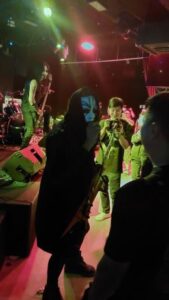 Actually, my T-shirt matched the macabre vibe established by the second support act, the Singaporean Tok Yathraa.  (I couldn’t get away from work early enough to catch the first support act, which was N3M3515 – think of those numbers as letters – described intriguingly online as a “one-man ChipDoom Project from Singapore, armed with a Classic Gameboy, combining elements from Sludge Doom and Hardcore.”)  Tok Yathraa is a black-shrouded, hooded, white-faced, rather Bergmanesque figure who, when interviewed on the Filthy Gods of Metal website, described himself as “a one-man band which started on 16th May 2020… heavily influenced by King Diamond, Mercyful Fate, Black Sabbath, Immortal, S.M. Salim, Judas Priest and Wings.”  It might come as a shock for the classic Malay singer S.M. Salim or, indeed, Paul McCartney’s Wings to find themselves included in such illustriously metallic company.  In the same interview, he called his music “bomoh metal, a fusion of black metal plus heavy metal plus focusing on subjects of local / Asia ghosts.”