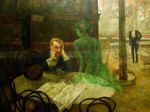 Onto something more elegant. I love old posters and illustrations advertising that most decadent of alcoholic drinks, absinthe. These were often the work of Art Nouveau artists, most famously, Alphonse Mucha. But away from the gentle curves and nymph-like belles dames of Art Nouveau, there’s a darker school of absinthe artwork, which suggests the drink’s more sinisterly seductive and ruinous side. These feature green devils, black cats and, depicted in this painting from la Belle Epoque, a splendidly vaporous green lady-ghost. It’s entitled Absinthe Drinker and is the work of the Czech artist Viktor Oliva, who reputedly quaffed much of the stuff in Paris in the late 19th century. Absinthe Drinker now hangs in the Zlata Husa Gallery in Prague.