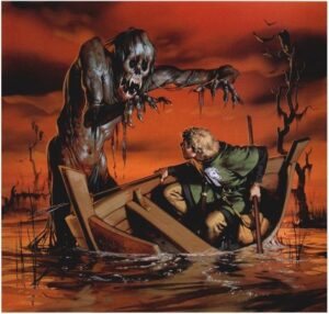 Let’s begin with a great, old-school horror illustration where an unwary boatman has an encounter with a marsh-monster. This was painted by the late Angus McBride, an artist who was born in London to Scottish parents but spent much of his professional career based in South Africa. McBride’s resume included work for the educational magazines Look and Learn (1962-82) and Worlds of Wonder (1970-75), the Men-at-Arms series from Osprey Publishing and the tabletop game Middle-earth Role Playing inspired by the works of J.R.R. Tolkien. In fact, it’s from a collection of those last illustrations – Angus McBride’s Characters of Middle-earth (1990) – that this ghoulish picture comes. The hideous beastie is actually a Mewlip, which The One Wiki to Rule Them All describes as ‘a fictional race, made up by Hobbits of the Shire, mentioned only in one poem.’