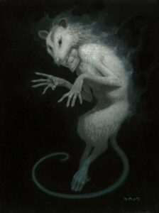 And keeping with rats, this gleeful-looking half-human, half-rat creature never fails to give me the creeps. It’s the work of the American artist Brom, originally from Albany, Georgia. His career has included illustrating the roleplaying worlds of Dungeons & Dragons and, more recently, providing pictures for as well as writing his own horror novels. This illustration comes from his 2021 novel Slewfoot: A Tale of Bewitchery.