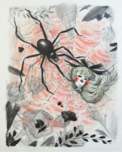 This next work, Can You Show Me the Way Home by Californian artist Brandi Milne, feels like it could be an illustration from a movie poster. Maybe one for a warped 1960s psychological thriller where children are imperiled, like Bunny Lake is Missing (1965), The Nanny (1965) or The Mad Room (1969). Of course, it also echoes that hoary old 1958 sci-fi / horror movie The Fly, whose finale has a human / fly hybrid – David Hedison’s tiny head grafted onto a fly’s body – trapped in a spider’s web, while the humungous spider crawls hungrily towards it. Rather than an attached-to-a-bug David-Hedison-head, Can You Show Me the Way Home artfully features a detached doll-head. Also, it’s disarmingly presented in a child-like palette of black, white, grey, pink and straw-yellow. Though going by the size of the doll-head, its spider must be pretty humungous too.