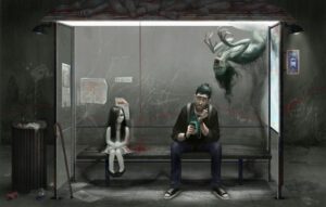 And there’s an obvious cinematic vibe – J-Horror this time – from this picture by Ohio-based concept artist David Sladek, aptly titled Waiting at the Wrong Bus Stop. It strikes a particular chord with me. During my misspent youth, I occasional spent too long in a pub on a Friday or Saturday night and then found myself waiting for a late-night bus, in a decrepit and remote bus shelter, in the company of various unsavoury-looking characters. Though none of them ever looked as unsavoury as the characters here.