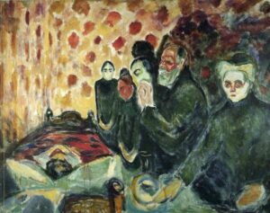 You get the impression la Belle Epoque passed by the great Norwegian painter Edvard Munch, whose paintings – most famously The Scream (1893) – often suggest he lived in a state of perpetual, nerve-jangling anxiety. During his childhood, he suffered the trauma of losing his mother and sister to tuberculosis and getting a bout of it himself when he was 13: “One Christmas Eve, when 13 years old, I lie in my bed,” he recalled. “The blood trickles from my mouth – the fever rages in my veins – fear cries out deep within me. Now, now, in just a moment, you will meet your Maker and be sentenced for eternity.” In 1893, drawing on those experiences, he painted By the Death Bed (Fever) with pastels. He would do further versions of it, with oils in 1895 and 1915 and as a lithograph in 1896. It’s the 1915 By the Death Bed (Fever) that I find most disturbing. The white-skinned, almost skull-faced woman on the right could pass for the Angel of Death, while the appropriately diseased-looking wallpaper resembles a close-up of a yellow handkerchief, into which a TB victim has just coughed globs of blood. Actually, the décor puts me in mind of one of the best horror short stories of all time, Charlotte Perkins Gilman’s The Yellow Wallpaper (1892).