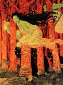 Meanwhile, proper wolves – though perhaps they’re werewolves – feature in this beautifully evocative watercolour, ink and pencil work done by the Swiss artist Eugene Grasset in 1892, Three Women and Three Wolves. I love everything about it: the trio of eerily floating women, who must be witches, or nymphs, or spirits, and the half-shocked, half-indignant way the nearest woman looks out of the picture at us; the three black wolves also looking, and laughing, out of the picture; the subtly-patterned russet trunks of the forest trees; the carpet of ferns. And what’s that lying in the bottom left-hand corner? A horn? A hunting horn? Have the wolves just been chomping on a huntsman? No wonder they look so jolly.