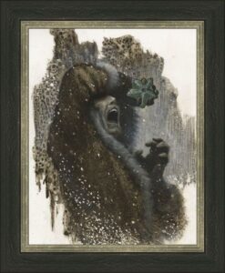 There aren’t any wolves, giant rats, giant spiders, J-Horror apparitions or any other monstrosities in this illustration by another Californian, Michael Whelan, described as ‘one of the world’s premier artists of imaginative realism’ and the most lauded artist in the history of science fiction. (He has 15 Hugo Awards under his belt for a start.) Done in acrylic, it’s an interior illustration for a Centipede Press edition of the famous H.P. Lovecraft novella At the Mountains of Madness (1931) which, as far as I can ascertain, hasn’t been published yet. It’s the pictorial equivalent of a cinematic reaction shot. But what a reaction. The screaming explorer conveys all the cosmic horror that makes this particular story, set in the wastes of Antarctica, so claustrophobic. Particularly clever are the margins of grey fur along the edges of the explorer’s garments. They’re arranged so that they resemble that most Lovecraftian of motifs – a coiling tentacle.