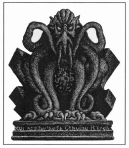 And on the subject of H.P. Lovecraft… I traditionally feature ten scary pictures in these annual Halloween posts. But this year, here’s an extra one, an eleventh, in honour of the legendary New Jersey artist Stephen Fabian, who sadly died in May this year (admittedly at a grand old age of 95). I admire the black-and-white interior designs he did for a 1998 volume entitled In Lovecraft’s Shadow, which is a collection of short stories not by Lovecraft but by his pen-friend and posthumous publisher August Derleth. Unfortunately, reproducing an entire illustration on this page would mean reducing it and shedding some of its intricate detail. So here’s part of an illustration for the 1948 Derleth short story Something in Wood. It shows a statue of Lovecraft’s ghastliest and most famous deity, Cthulhu, looking tentacle-y and baleful, as ever.