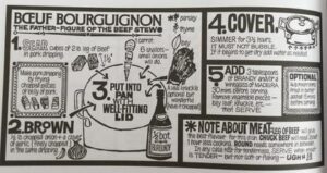 The character’s enthusiasm for a quality meal reflects a similar enthusiasm on his creator’s part. Indeed, when he was still working an illustrator, Deighton spent four years producing Cookstrips for the Observer newspaper. These were what nowadays we’d call ‘infographics’. Each presented a recipe for a particular dish, with pictures, arrows and a minimum of text making the preparation process as simple and clear as possible.