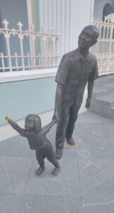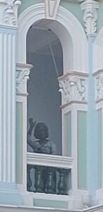 Standing outside the museum entrance are statues of a man and a little girl, the girl waving up at a balcony on the museum’s façade. I got a jolt when I glanced up at the balcony and spotted a spectral figure there, standing within an archway. Really, though, it was just another statue, of an old lady waving down at the girl. It was still daylight, but Eugene’s tour was evidently starting to unsettle me.